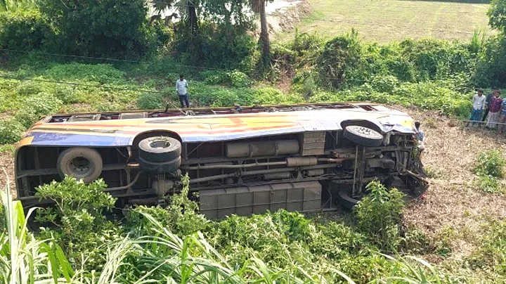 সোমবার (১৩ এপ্রিল) উপজেলার বাবলাতলা এলাকায় এ দুর্ঘটনা ঘটে। এতে যাত্রীবাহী বাসটি সড়ক থেকে ছিটকে ২০ ফিট গভীর খাদে পড়ে উল্টে যায়। ফরিদপুরের ভাঙায় একটি যাত্রীবাহী বাস ও বাঙ্গি বোঝাই পিকআপের মুখোমুখি সংঘর্ষে বাস উল্টে খাদে পড়ে দুইজন নিহত হয়েছেন। এ ঘটনায় আহত হয়েছেন অন্তত ২৫ জন।